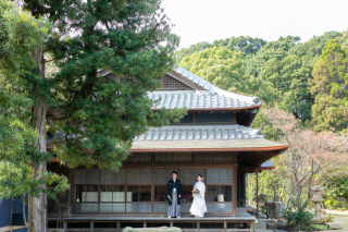 福岡市南区の都市公園「高宮南緑地」内にある歴史的建造物「旧高宮貝島家住宅」にある結婚式場「高宮庭園茶寮」。大正時代に建てられた近代和風建築で、福岡市登録文化財となっており、邸宅を囲むように庭園が広がります。