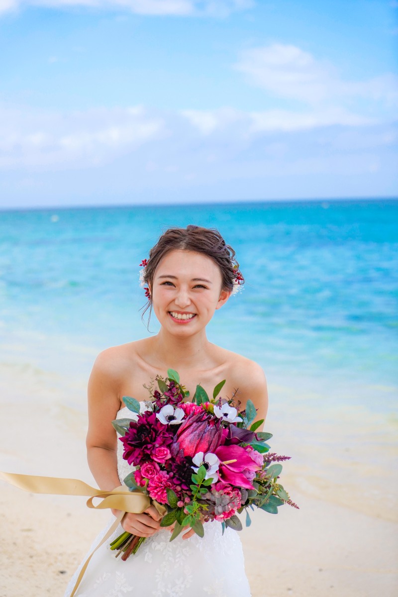 ・ビーチやリゾートでの撮影: 暑さや潮風に強い造花(アーティフィシャルフラワー)が安心です。プルメリアやトロピカルな色合いのブーケが雰囲気にマッチします。