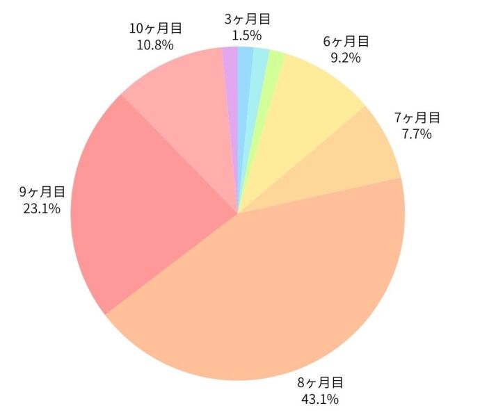 Photoraitが2025年5月に実施した「マタニティフォト(妊娠写真)に関するアンケート」においても、60%以上の方が「妊娠8ヶ月~9ヶ月」の時期に撮影をされていました。