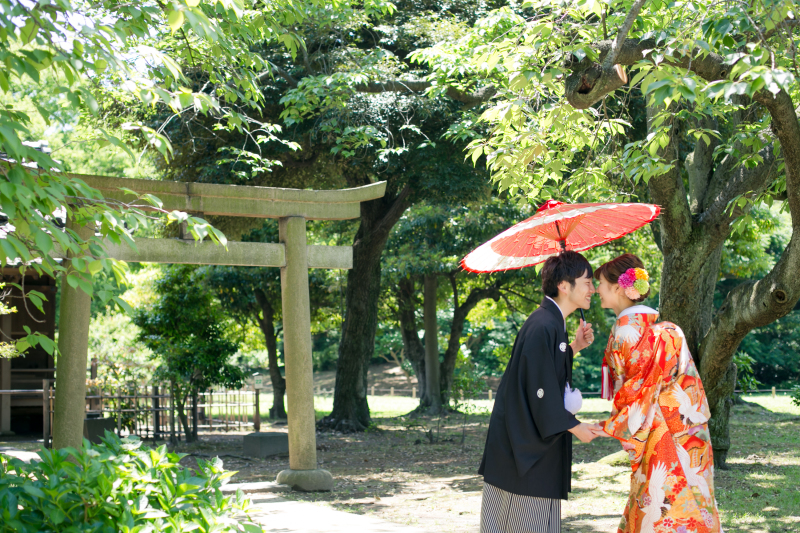 式場の庭園、神社の庭、日本庭園など、和装にピッタリなロケーションはたくさんあります。景色とともに、思い出を結婚写真に記録しましょう。