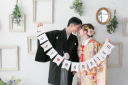 お二人のバックには梅の花が!とても風情あふれる一枚ですね。