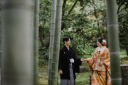 お寺ならではの荘厳な建物を背景に、凛とした立ち姿のお二人。