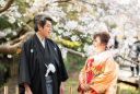 桜に囲まれてのカット!桜もお二人の笑顔も満開です♪