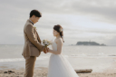 橋の上で三重塔をバックにそっと手を取り合うお二人です♪