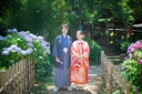 にっこりと見つめ合うお二人*紫陽花の花が季節を感じられて素敵ですね!