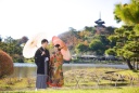 秋を感じさせる美しい紅葉と三溪園の大池をバックにおふたりポージング。しっとり美しい絵になる一枚です。