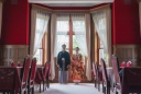 まずは白無垢での撮影からスタート。お二人のお衣装の組み合わせがとても素敵で、和装ならではの華やかさと上品さが引き立つ1枚に仕上がりました。光や背景との相性もいい