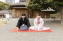 咲き始める梅と共に、華やかに映えるお二人。春らしさが伝わる一枚です。
