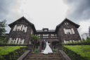 木の壁をバックにまずは笑顔でシンプルに^^笑顔がお似合いなお二人です♡赤の番傘も映えますね♪