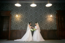 二人で見つめ合って笑っているお写真^^ご新婦様のピンク色の色打掛、すごく可愛いですね♡