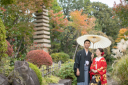 黄色に染まる銀杏並木をバックに番傘のふたり。和装が映えますね!