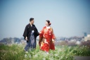 ご新婦様のソロショットになります。赤の番傘でパッと華やかに