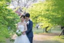 ご新郎様にそっと寄り添うご新婦様。桜をバックにとても華やかな1枚です!