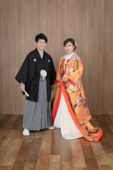 手を繋いで見つめあうお二人♡色打掛のバックスタイルもステキです☆