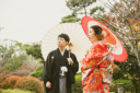 和傘をさしてにっこり微笑み合うお二人!微笑ましいお写真ですね