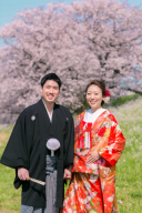 桜をバックに!!満開で和装が映えるお写真ですね!!