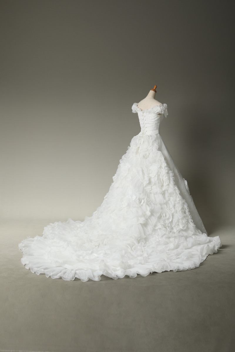 グリッターオーガンがキラキラと美しく輝くAラインドレス。フリルをあしらったコンパクトなオフショルダーはデコルテラインを華やかに彩ります。スカートに大胆に配された立体的なフラワーがこの上なくロマンティック*オフショルダーが華奢な体を演出。