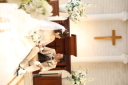 新婦様に壁際に立っていただいたお写真です。手前でぼやけているのは聖壇のお花です