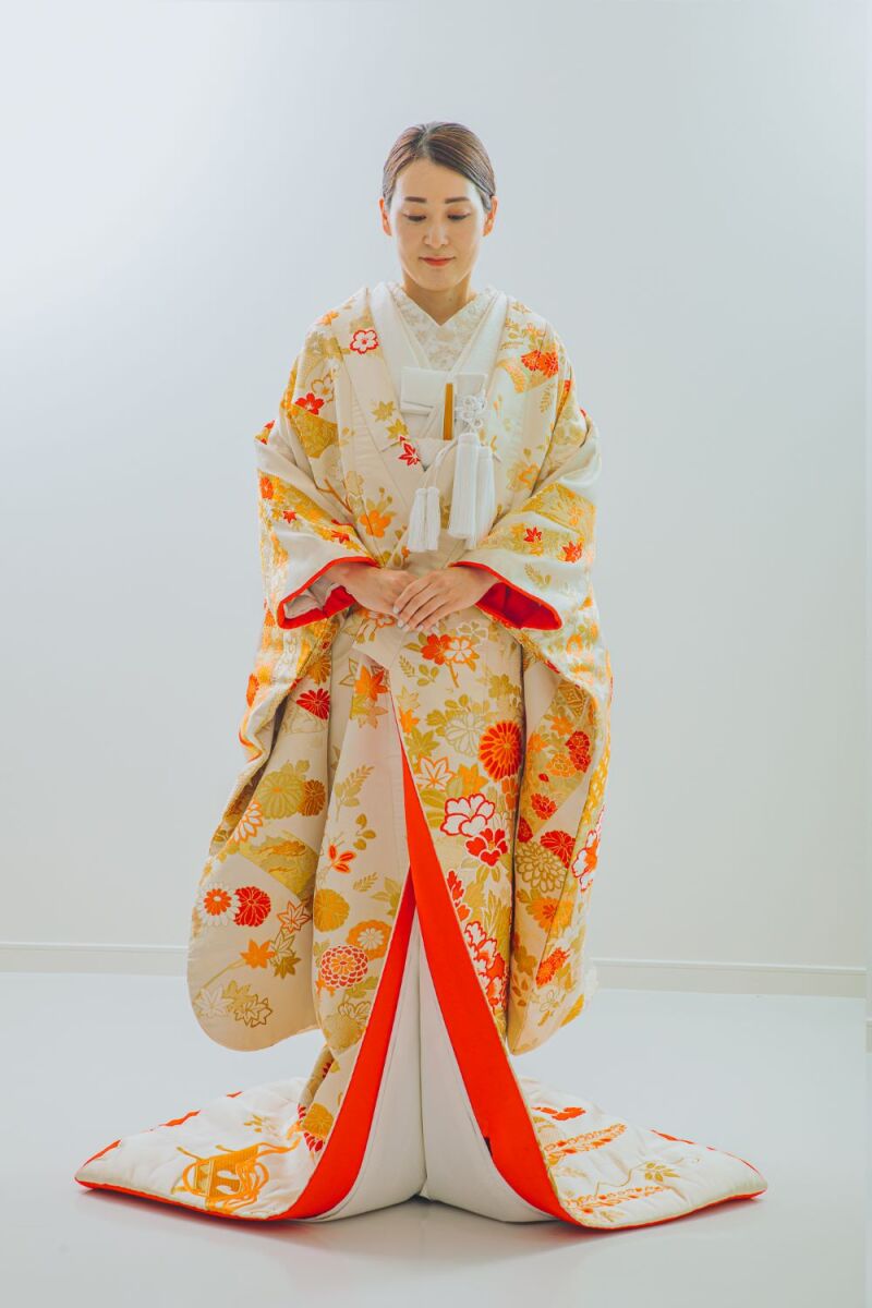 背面に熨斗、前面は季節のお花がオレンジ、赤色、ゴールドで描かれており、女性らしさが引き立つ1着。