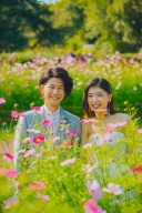 スタジオ内フラワーウォールが可愛い洋装撮影!お二人の笑顔も◎◎