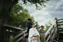 息をのむほど美しい白無垢の後ろ姿。伏し目がちな目線が、凛とした美しさを一層引き立てます。伝統的な装いに込められた様々な想いが、見る人の心に深く響く一枚。