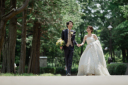 純白のドレスと新緑のコントラストが美しい背中合わせショット。