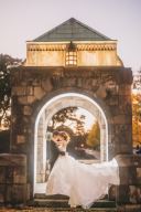 全身が映る構図でも。レンガの壁や石造りの花壇など、レトロな雰囲気のロケ地に素敵なお色味のドレスがピッタリでした。