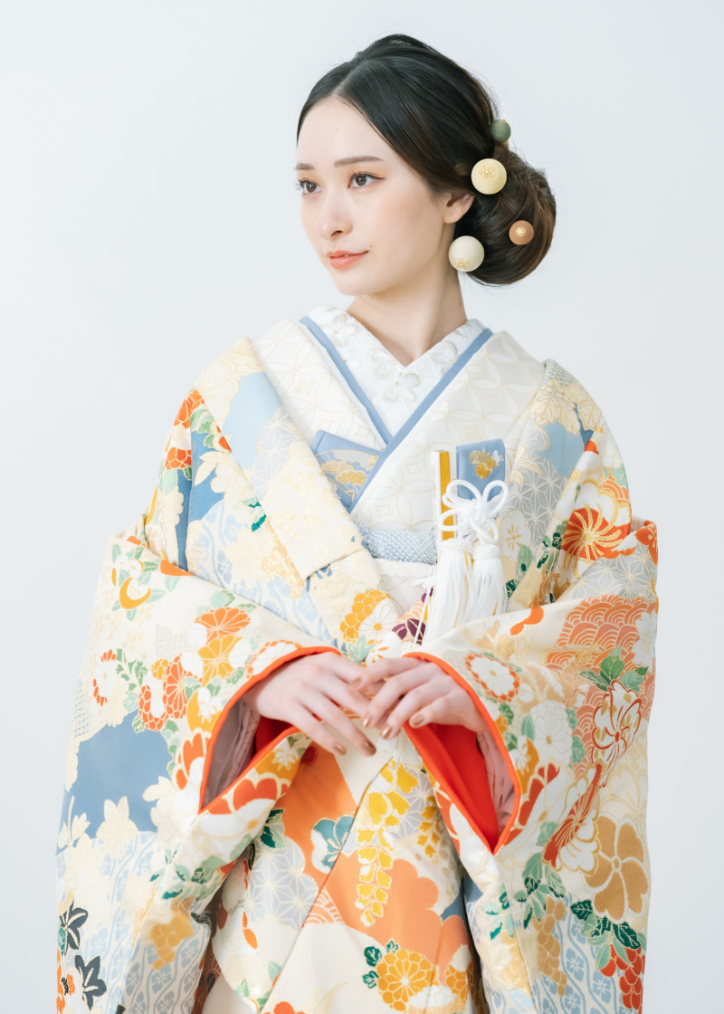 牡丹や菊のモチーフが華やかな色打掛。果てしなく続く山々に有職文様を添えて、自然風景を穏やかに表現する様は、とても優美で気高く、その山々を更に彩る牡丹や菊のモチーフが 晴れの日の花嫁様をより一層輝かせてくれる西陣織の逸品です。