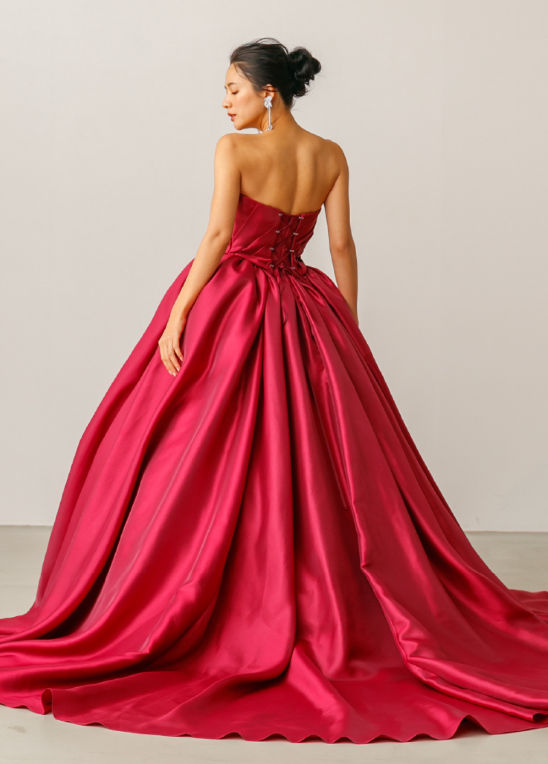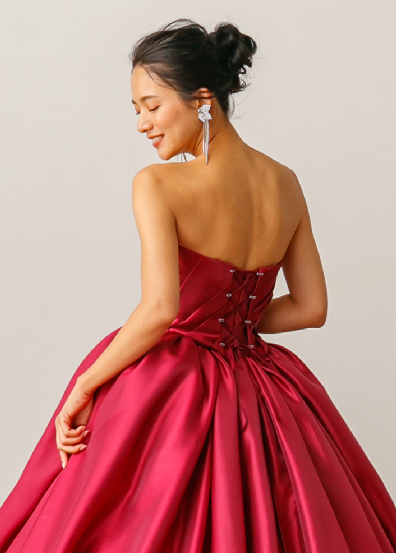 シックで上品な深みのあるボルドーカラー。流れるようなドレープでウエストをスッキリ見せながらたっぷりとボリュームのあるスカートでメリハリをつけスタイルアップさせてくれるこだわりのシルエット。存在感のある取り外し可能でスタイルアップ効果も。