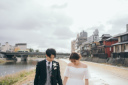 3着目はカラードレスにチェンジ♪夕日が沈む京都の風景をバックにロマンチックなお写真に。