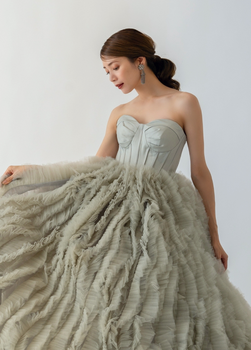スモークツリーのような大人カラーのドレス。デコルテラインを美しく見せるインパクトのあるデザインが特徴です。チュールを一枚一枚贅沢に重ねた立体感のあるスカートで仕上げました。ボリューミーで丸みのあるデザインは大人の可愛さを演出してくれます。