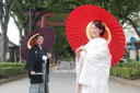 白無垢の清らかで厳かなイメージを華やかな背景が彩る……という撮影もできたりします。