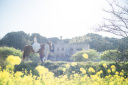 緑と花に囲まれた噴水の前で、プロポーズ風写真を。実はこの写真、新郎さんよりも新婦さんのポーズの方が難易度が高いんです。