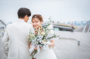 白いドレスとブーケの上で重なりあう手の肌の色が印象的に写ります。