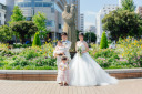 大さん橋のクジラの背中にて、360度広がった空に浮かぶ金色に輝いた雲が二人を祝福していました。