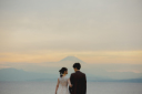 太鼓橋のてっぺんで互いの額を寄せ合うお二人に、柔らかな秋の光が輪郭をかたどり印象的な一枚となりました。