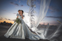 胸元に寄せた白蘭のブーケの意味は「清純」。これから二人のカラーに染まっていくことでしょう。重ね合わせた手にはマリッジリングとエンゲージリングが光ります。