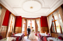 白いウエディングドレスと赤いお部屋のコントラストも素敵です。