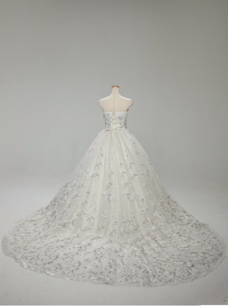 こちらはお洒落なシルバー刺繍がポイントのAラインドレスです。シンプルでありながらも繊細なデザインとトレーンの広がりが大きいお衣裳になりますので華やかなドレスになります。シンプルさやナチュラルさがお好みの方に【取り寄せ衣裳】