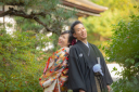 赤のもみじとカラフルな色打掛がぴったり!ドシっと構える新郎さま。
