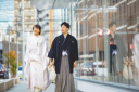 赤い紅葉を背景に!和装と秋の紅葉の相性バッチリです!