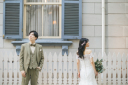 緑の中に差し込む光に包まれて。ドレスとタキシード姿が幻想的です◎