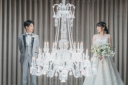 まずは青い壁紙の前でかっちりとしたお写真*白で統一されたお2人のお衣装が凄く映えていますね!
