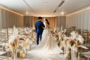 ボリュームのあるドレス。オフホワイトのドレスがニュアンスカラーのブースとぴったり!
