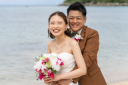 笑顔が素敵なご新婦様のソロショット 後ろの爽やかな海とマッチしていますね^^