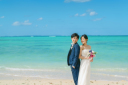 ブーケで顔を隠した素敵なショット 青い空、青い海がさらに映えさせてくれます