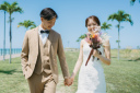 まずはビーチ撮影!お支度が完了してビーチに移動☆最初はおふたりの後ろ姿からお撮りして緊張をほぐしていただきます♪カメラに向かって振り返り笑顔^^
