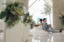 アテンドスタッフがドレスのトレーンをフワッと投げて躍動感のある一枚となりました^^トレーンが長いドレスだと撮り方のレパートリーも増えます♪