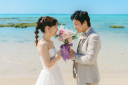 まだ緊張感も伝わる1枚です^ ^青い海とお二人は映えますね!風が強い日でしたので髪もしっかり固めてます♪