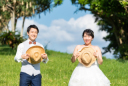 南国の木々や花々に囲まれたチャペルをバックに!おふたりの仲の良さが伝わります